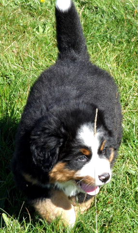 The 7 week old Mountain dog pup playing in the long grass durng a break in the day.