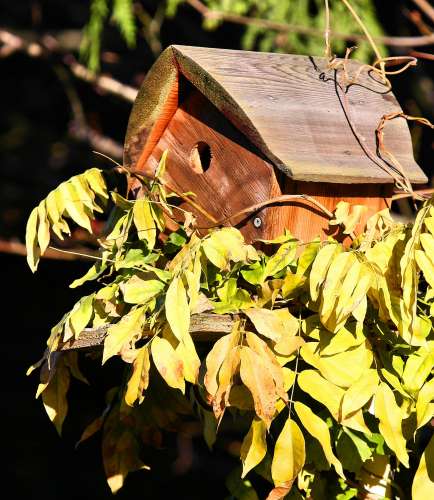 birdhouse in our backgarden, with the winter sunlight enhancing the wisteria vine leaves