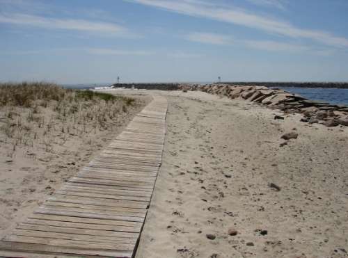 This boardwalk runs across the sand dune and along the jetty primarily to keep people away from the dune grass and bird nests.