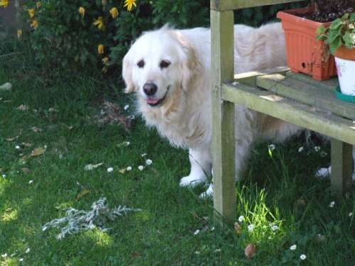 Breeze playing chase with her brother rusty, she had stopped for a breather beside this garden set.