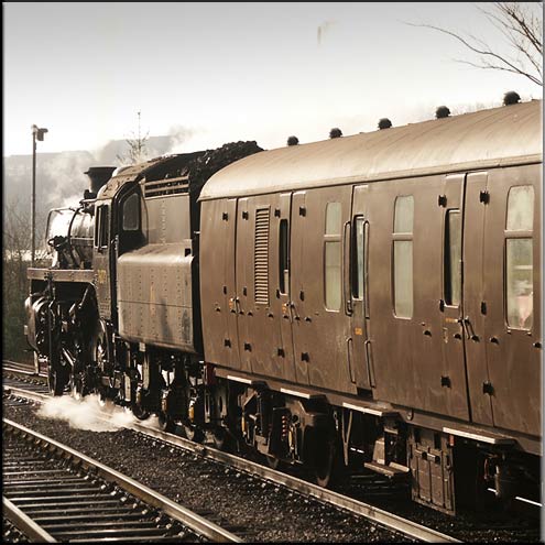 Locomotive 76079 catches the weak early moring sun just before departure from Ramsbottom station on the East Lancashire Railway.