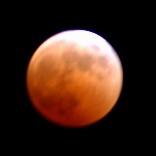 10:22 PM EST. I changed from shutter priority to aperture priority to take an image of the red shadow of the eclipse. The time of exposure was about 2 seconds.