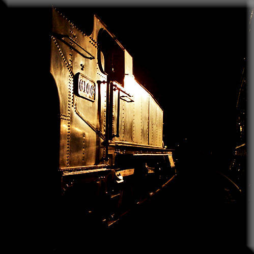 Great Western Railway engine no 6101 gleams under the spotlight at Didcot railway centre.
