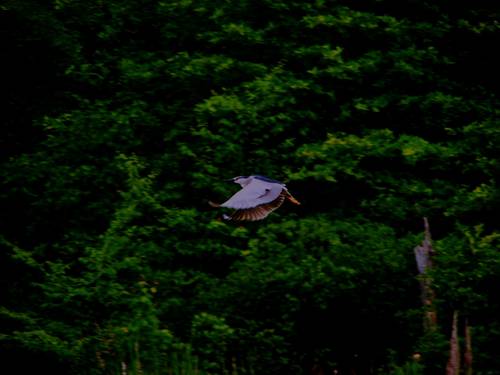 young heron flying at dusk over marsh