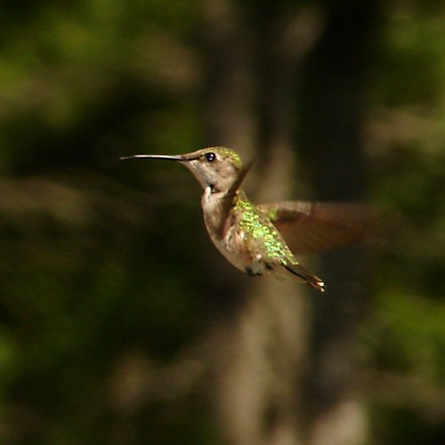 A ruby-throated hummingbird hovering before diving into the beebalm patch.