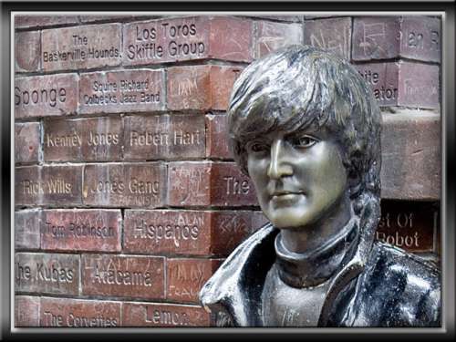 A statue of John Lennon in front of the Cavern wall of music in Mathew Street Liverpool.