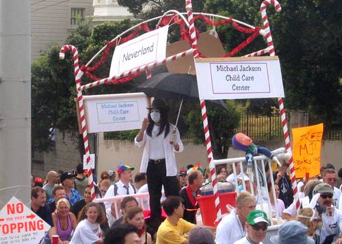 A Michael Jackson look alike is pulled along on his float at the 2005 SF Bay to Breakers. The float, (Neverland, Michael Jackson Childcare Center), like many in the race are a spoof on current events.