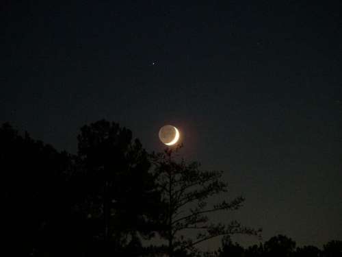 A tripod shot of the Moon. Two seconds at f3.1, no filters or processing. I really wanted to get the Earthshine (The dim section of the Moon.)and finally got it without overexposing the limb too badly.