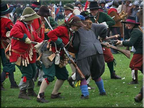 Musketeers fight in close combat during an English Civil War re-enactment at Croxteth Hall, Liverpool.