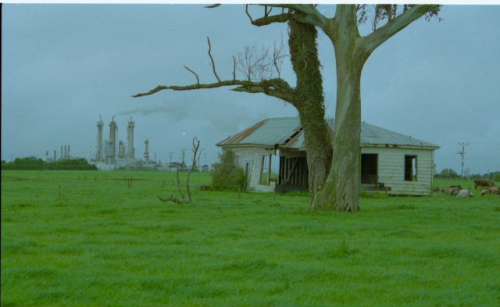 An old house, almost ready to collapse, with a production plant in the back ground both surounded by farm land