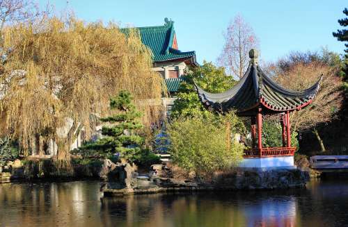 Pagoda and weeping willow beside the frozen pond in the public gardens downtown Vancouver, B.C. Canada, on a winter afternoon. November 30, 2007