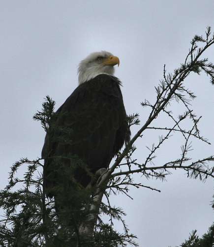 bald eagle with a proud appearance, in a treetop in our area on a mild day. Love the pale coloured eyes they have