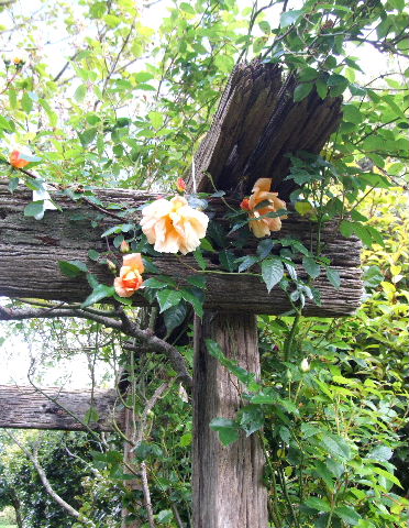 beautiful climbing rose on and arch way made from old railway sleepers.