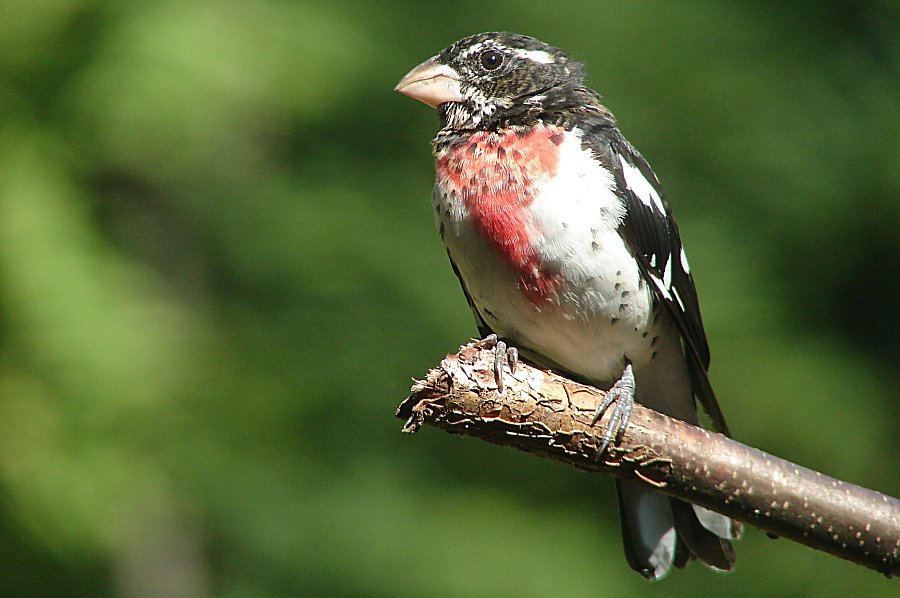 A juvenile rose breasted grosbeak perched on a branch near our feeders.