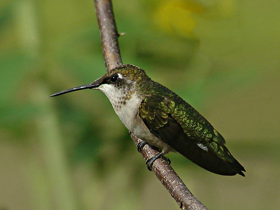 A ruby throated hummingbird perched on a branch and sitting in the morning sun.