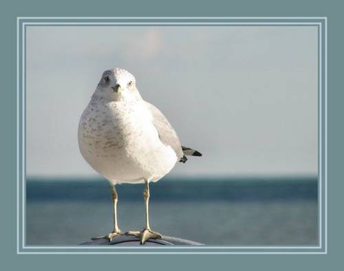 A seagull is standing and waiting for me to take a picture of him in his natural surroundings with the ocean in the background.