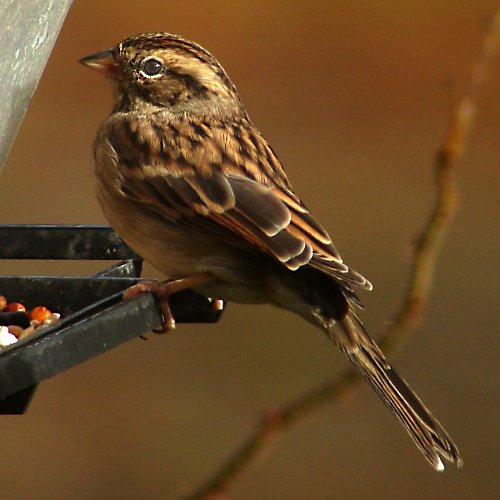 A sparrow at our bird feeder in the early morning sunlight.