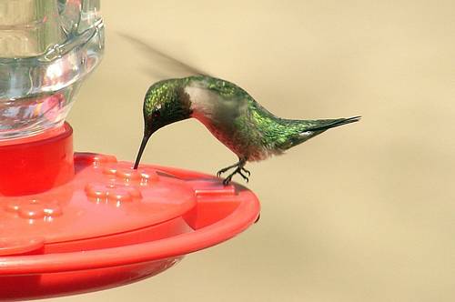 This ruby throated hummingbird appeared to be doing a dance at the feeder while he visited each feeding hole.