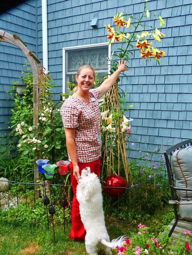 This lily really surprises me each year. It gets taller and taller. I couldn't get to the very top with my tape measure,but I measured over 7' and there was still more lily not touched. My daughter just getting done teaching and had stopped by for a visit. I asked her to stand next to the lily to give perspective on height. She is 5'4" tall. Not sure it gives good symmetry to the garden, but it is a point of interest.