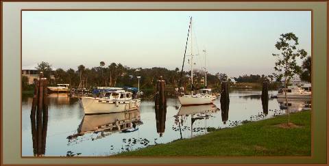 There was no room left at the campground docks on this night, so two late arrivals tied up fore and aft at barge piers