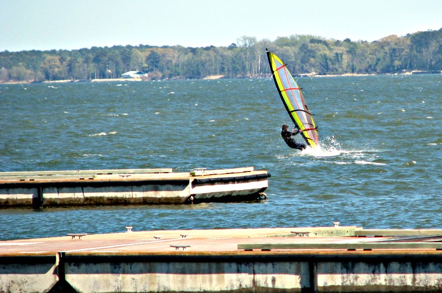 A wind surfer is headed for TROUBLE.