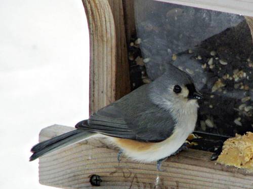 A tufted titmouse on one of our feeders for a taste of bark butter. (a soft peanutbutter,suet mix)