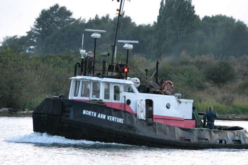 Tugboat "North Arm Venture", working on the North Arm of the Fraser River this evening. The captain saw me and blew the horn as they passed : ) The tug was pulling a huge barge laden with scrap metal