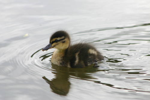 A duckling fishing on top of a pond in early spring.