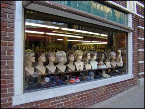 Not only are there wigs in the window but also the light from inside the store shows the wigs
