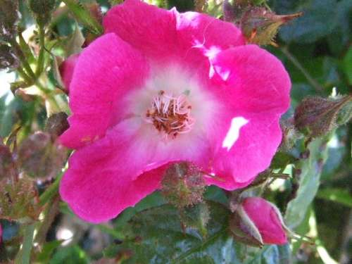 The flower of a climbing rose gone wild in a hedge.