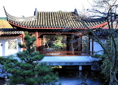 sunshine and shade in winter enhancing the architecture, ice covered pond, trees and view beyond.